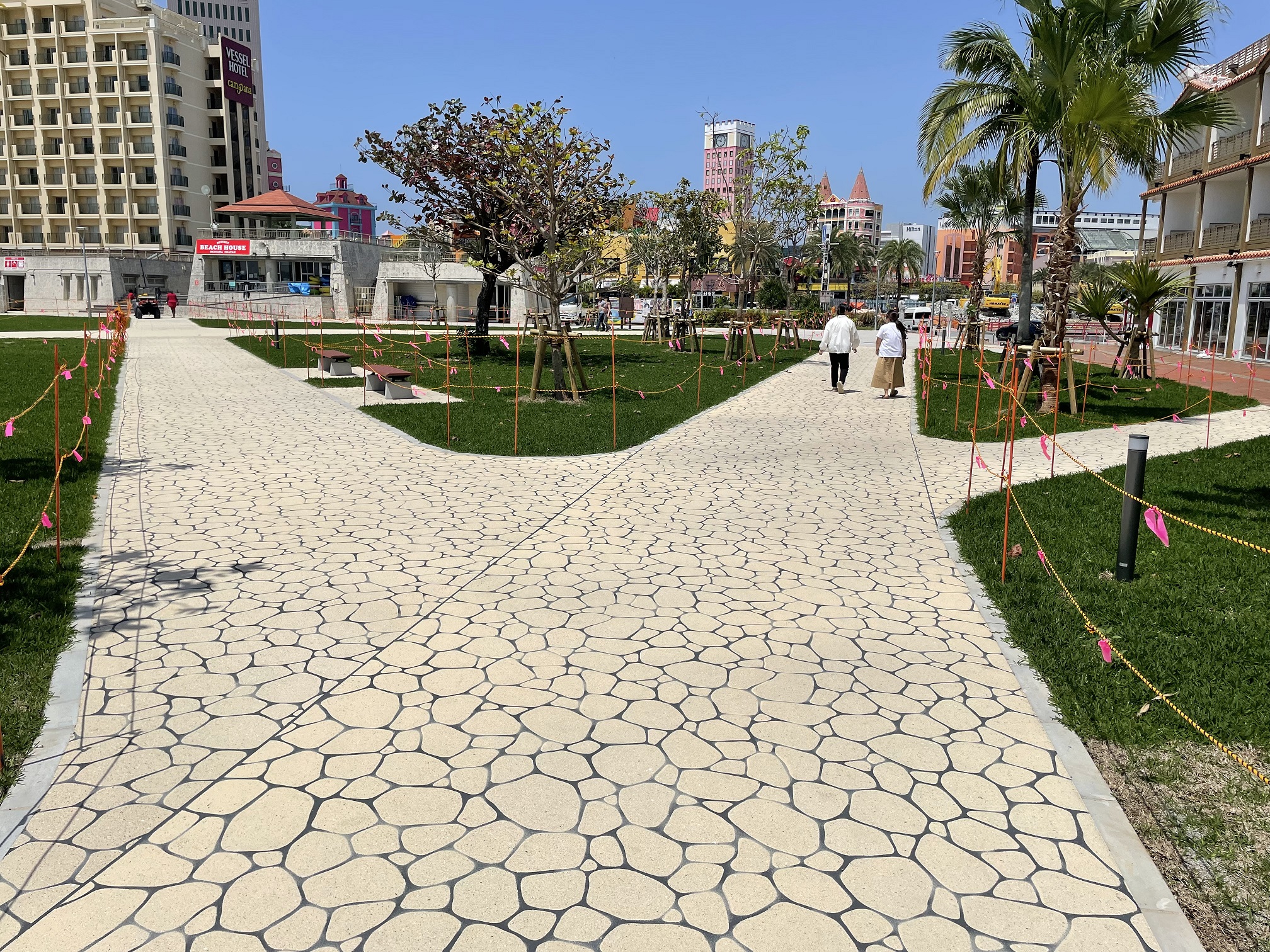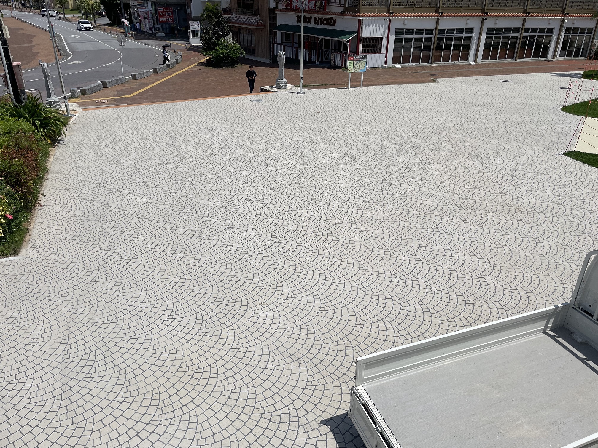 本工事は、北谷町のサンセットビーチにおけるアスファルト舗装面の保護とカラーリングを目的にした舗装です詳細写真はこちら① ②